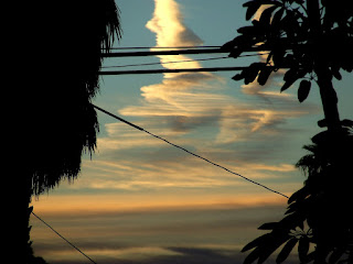 6:55 am, Pacific Beach, San Diego, looking south. Two parallel airplane trails linger in the sky, slowly merging into one artificial cloud.